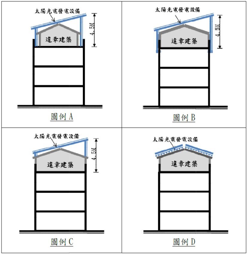 太陽光電設備(含支撐架)與違章建築結構分立。(如圖例A、B)