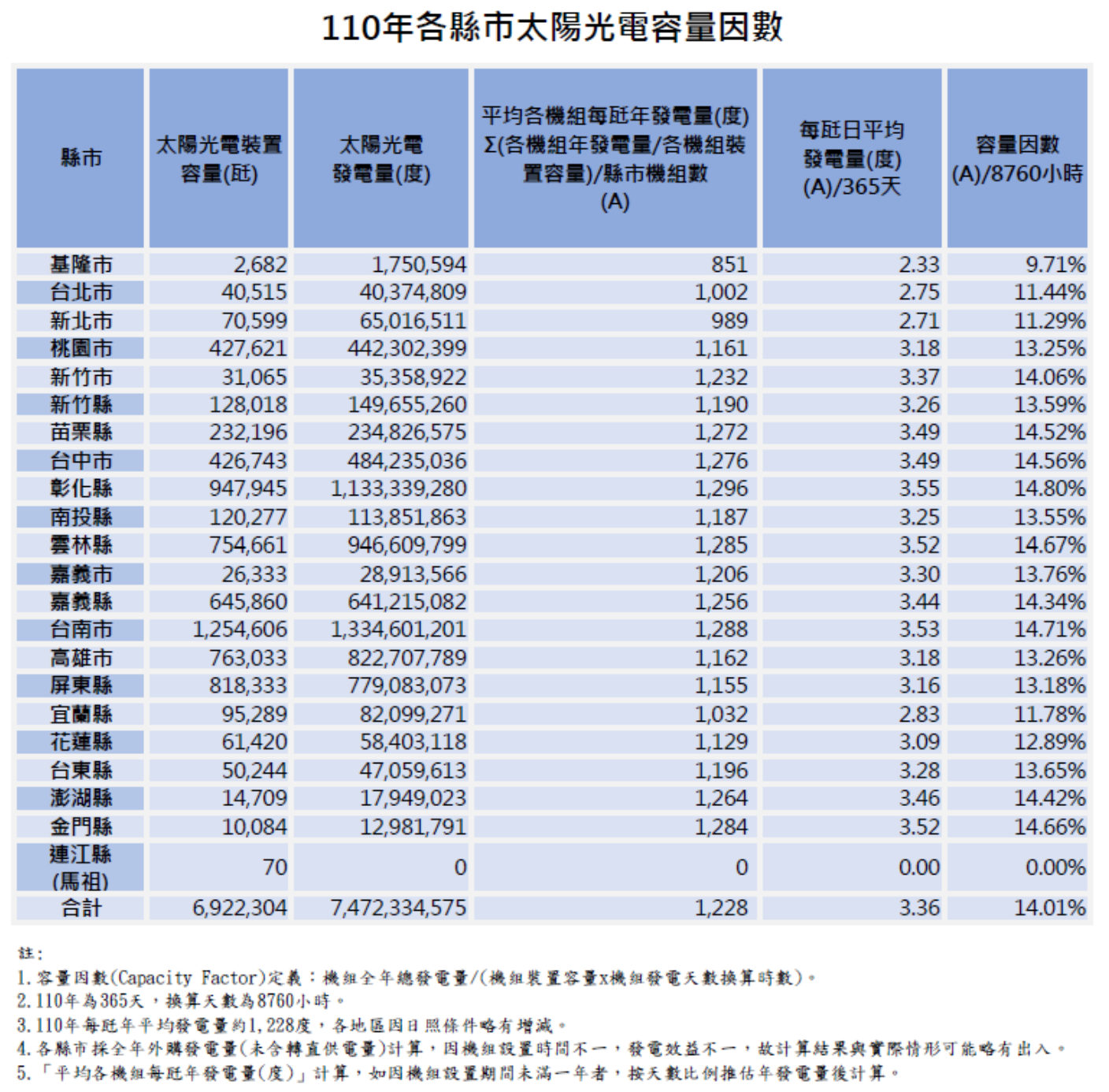 在發電設備中,常常人們會聽到容量因數的名詞,那這詞到底代表著什麼樣的意思呢? 容量因數是指一年8,760小時裡,此一發電設備所能發電的時數占比,也就是產能利用率的概念。越高越好,越低越差。 下圖的資訊為台電所公告110年的各縣市太陽光電容量因數。由台電的公告數據當中,我們可以觀察到越是往台灣南部的縣市太陽光電的發電量越好,第一名為彰化縣,平均每千瓦每年可發電1296小時,容量因數為14.8%。而越往北部則是越低,基隆因為多雨,平均每千瓦每年可發電851小時,容量因數只剩9.71%。 所以,您所在的縣市適合太陽能發電嗎? 圖片資料來源: 台灣電力公司