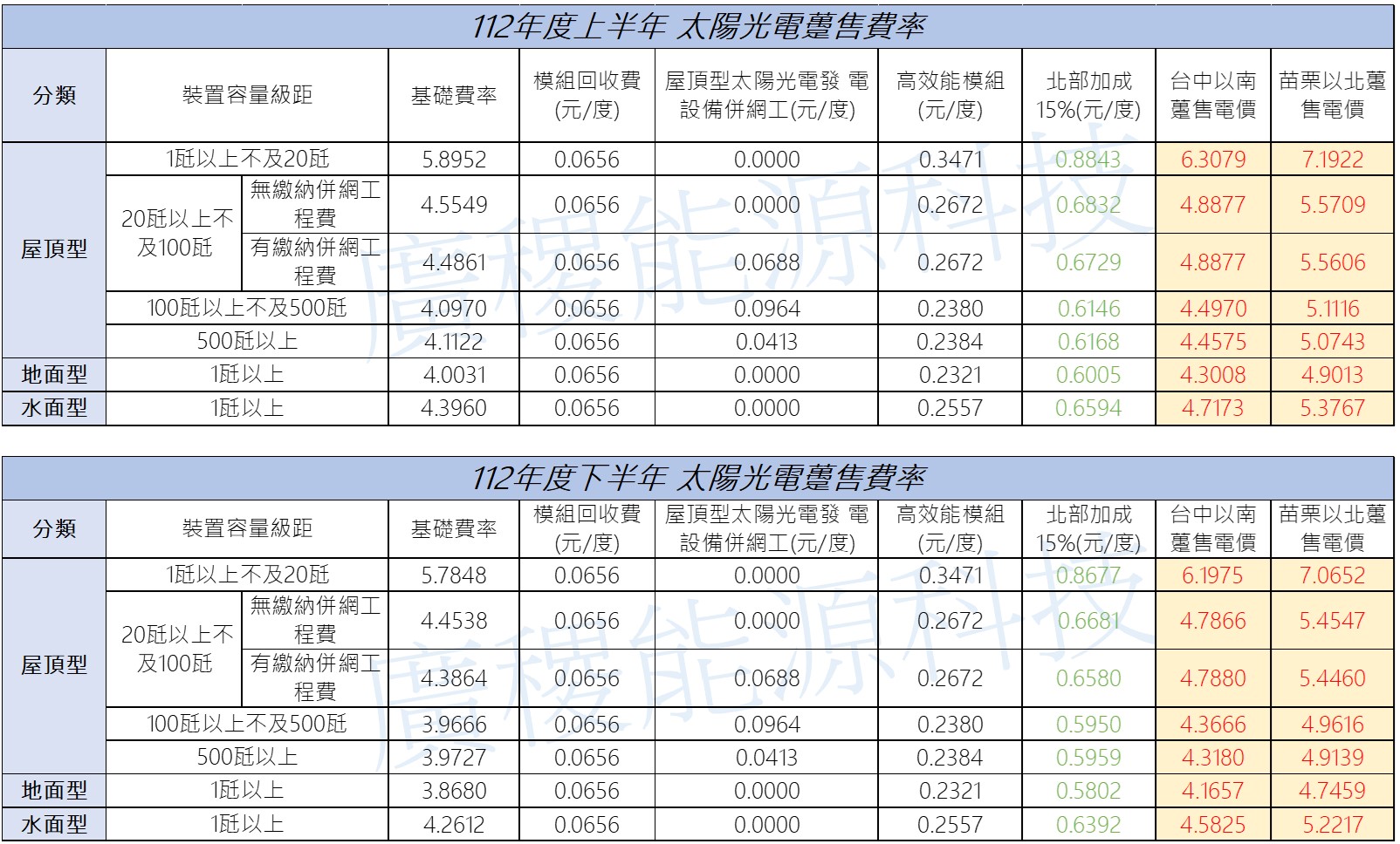 112年太陽光電躉售費率出爐囉! 經濟部考量國內太陽光電產業當前仍部分受原物料價格及缺工因素影響,但今年度下半年營造工程物價指數有逐漸回穩趨勢,可望舒緩物價缺工因素對太陽光電開發影響,為兼顧目標量達成及鼓勵業者投入建置,決議費率維持111年度水準。 資料來源: 經濟部能源局